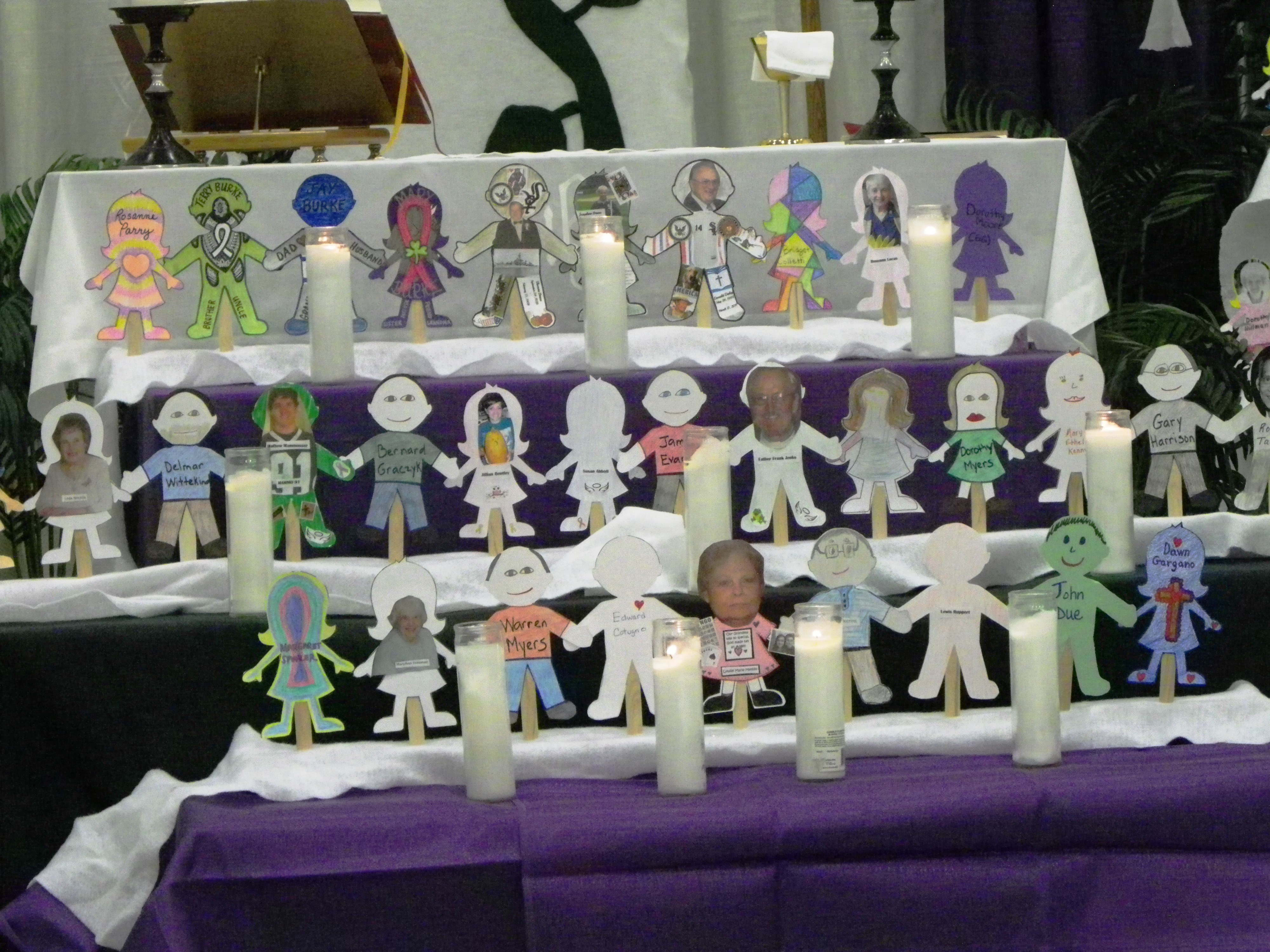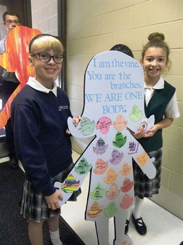 The Worship Commission, under the direction of Mrs. Bruno, consistently creates wonderful backdrops for our liturgies. Their transformative efforts for the annual Mass of Remembrance are especially meaningful for our school community. In keeping with our school theme this year, We Are One Body, small images of loved ones who have passed were represented on figures that were joined hand in hand. The figures were decorated by family members and contained symbols to celebrate the lives of those represented. Names were read and candles were lit to honor those loved ones who have died. The first grade students did a fine job orchestrating the liturgy celebration with some help from their 7th grade buddies. It was a lovely way to remember special people who are no longer with us on earth.