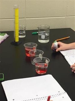 The sixth graders recently finished a chapter on matter and learned how the particles of a solid, liquid and gas are arranged and at what speed they move. The students then got to observe the movement up close. They placed food coloring drops in three different cups ( very hot water, ice water and room temperature water) and observed at different times how fast the particles of dye spread throughout the cups of water.