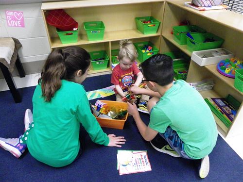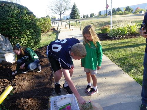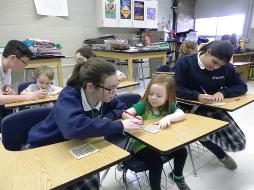 One of the best features of our PreSchool through grade 8 school is the fact that our older students buddy up with our youngest students. The sixth graders mentor the Preschool students, seventh graders buddy up with the 1st graders, and our eighth grade leaders take the Kindergarten students under their wings. The students get together frequently during the year and especially when the younger kids might benefit from some help from their older buddies. Enjoy some photos of a few the first buddy activities of this year! You will see older students reading to younger students, seventh graders helping their first grade buddies with a sight word activity and with addition fact bingo, and eighth grade buddies planting bulbs for springtime blooms with their kindergarten buddies.