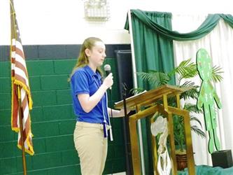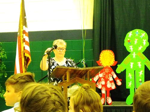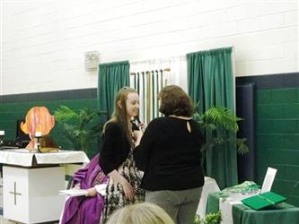 A very special tribute to all who have and are serving in the armed forces was the setting of the Veteran’s Table by some of our students. As the students placed the items on the round, white table, Mrs. Bruno explained their significance. The symbols that were part of this display included items such as a single red rose to remind us of the life and the blood that was shed and a slice of lemon to remind us of the bitter fate of those captured and missing in a foreign land. There was a lit candle to show that America is a light in a world of darkness and salt to symbolize the tears of the families with missing soldiers. A Bible represented the strength gained through faith and an inverted glass and tilted chair signified the inability of those lost to wars to share in the Eucharistic meal with us.