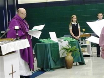 The seventh grade students orchestrated our Thanksgiving Liturgy on Friday, November 17. The entire school community took time to offer thanks for our many blessings. Included during the liturgy was also the commissioning of two new Eucharistic Ministers for our school, Mrs. Lerch and Mrs. Salomone, and a blessing for all of those who serve in this capacity at our liturgies. Finally, during the month of November, the Student Council sponsored a food drive so that we could share our bounty with the less fortunate. Father Brian blessed the food that was delivered to a local community food pantry later in the day.