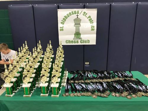 St. Alphonsus/St. Patrick School hosted it’s thirteenth annual chess tournament at school on Friday, November 3. Eighty-eight chess players from nine different schools competed in four divisions. Our chess club performed extremely well! In the Grade K-1 division, Joey received a fifth place trophy! In the Grade 2-3 division we had all of our players placing in their division, including Tommy, Emmett, Corey, Matthew and Jack. These boys brought home a third place trophy! This was quite an accomplishment as there were over 30 players in this most popular division! In the Grade 4-5 division, Gabrielle was our school's sole representative, but she represented us very well by placing in her division! Ian, Alex, Max, Danny and Zach also placed in their division, enabling our Grade 6-8 division to bring home the first place trophy! Coach Theo is very proud of all of these hard working children and their success! The chess club and Coach Theo would like to extend a special thank you to all of the amazing St. Al/St. Pat’s chess parents for their hard work orchestrating this tournament!!