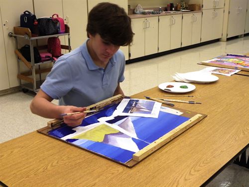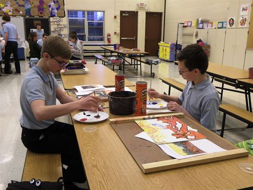 Each year, Mrs. Parry, our Fine Arts teacher, guides the eighth grade students on a journey that culminates in a piece of artwork. Like the masterpieces that these student creations emulate, the paintings require several stages and take quite some time to reach their framed display state during Catholic Schools Week. As the students work on the art, they are also journaling and writing a poem inspired by their painting in their language arts classes with Mrs. Bruno, and applying math skills as they maintain the proportions of their painting on their canvas. Along the way they also employ technology to help with research and to communicate about their overall experience. This amazing learning experience teaches the students about art, about perseverance, about what it really takes to create a masterpiece on canvas that lives on long after the artist, and finally, about themselves and what they are capable of doing. These photos depict some of the early struggles of the student artists as they endeavor to get the colors and proportions just right. Included are also the final paintings of our young artists. The paintings debuted during Catholic Schools Week at the Art Fair, and remain on display in the front entrance of the school.