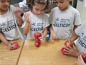 Our first graders learn all about apples during the Fall season! Last week, they performed many apple explorations. They learned that apples do float in water. The students tried balancing apples on top of one another. They also tried to balance apples on their own heads! First graders combined apples and geometry by forming geometric shapes with cut up apple pieces and toothpicks. The children are also creating a diagram of an apple tree in all four seasons in the computer lab and they will be graphing the results of other apple investigations they will do in the classroom. Apples are amazing!