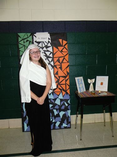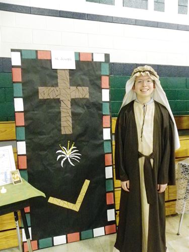 Under the direction of Mrs. Bruno, the eighth grade teacher, each eighth grader dressed up to represent their chosen Confirmation Saint and posed beside a stained glass window backdrop that they had created. The “stained glass windows” were filled with rich symbolism important to their Saint’s story. Complete with candle light and hushed voices, the setting became a very holy place and a spectacular way to honor All Saints Day. The younger grades and other visitors were welcomed in and, after an introductory Litany of the Saints, they gathered in small groups at each Saint to hear the story of their life. Young children and visiting adults alike listened with rapt attention as the 8th grade Saints revealed details about the faith and life of the inspiring person they represented. As the young students left the tableau, they were able to choose an artifact or holy card that the eighth graders had made to remind others of their Saint.