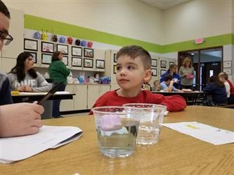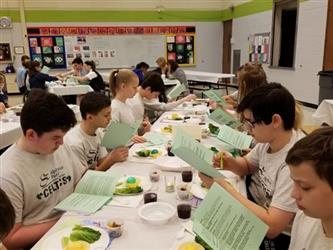 Finally, the eighth grade has been learning about physical and chemical changes and properties. They were able to actually observe those types of changes in action by viewing what happens when substances such as baking powder, baking soda, cornstarch and powdered sugar were mixed with liquids like water, vinegar and iodine. Students needed to determine which showed physical or chemical changes and which demonstrated soluble or reactive properties.
