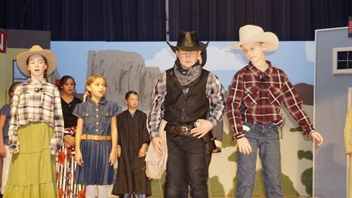 This charming musical drama was hugely successful thanks to the dedicated sponsors, the hardworking student performers, and the many supporting parents and staff members who helped with arranging all of the other necessary components of the play. The entire school community took delight in watching “our kids” work musical magic on stage as the Wagon Wheels West story unfolded. Everyone, actors and audience alike, look forward to future performances by our drama club members!
