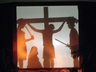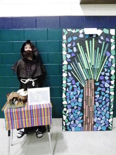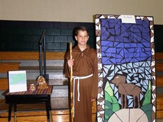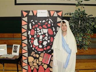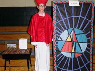Under the direction of Mrs. Bruno, the eighth grade teacher, each eighth grader dressed up to represent their chosen Confirmation Saint and posed beside a stained glass window backdrop that they had created. The “stained glass windows” were filled with rich symbolism important to their Saint’s story. Complete with candle light and hushed voices, the setting became a very holy place and a spectacular way to honor the upcoming All Saints Day. The younger grades and other visitors were welcomed in, and, after an introductory Litany of the Saints, they gathered in small groups at each Saint to hear the story of their life. Young children and visiting adults alike listened with rapt attention as the eighth grade Saints revealed details about the faith and life of the inspiring person they represented. As the young students left the museum, they were able to choose a prayer card that the eighth graders had made to remind others of their Saint.
