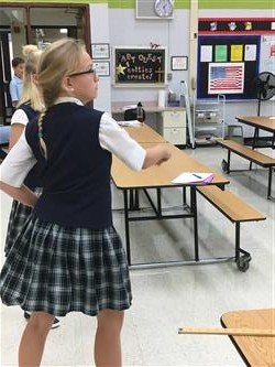 The eighth-graders have been learning about the scientific method. Their task in a recent experiment was to design two paper airplanes, one with flaps and one without. When creating their plane, they needed to include each step of the scientific method, carry out the actual experiment, collect their data and form their overall conclusion based on their data.
