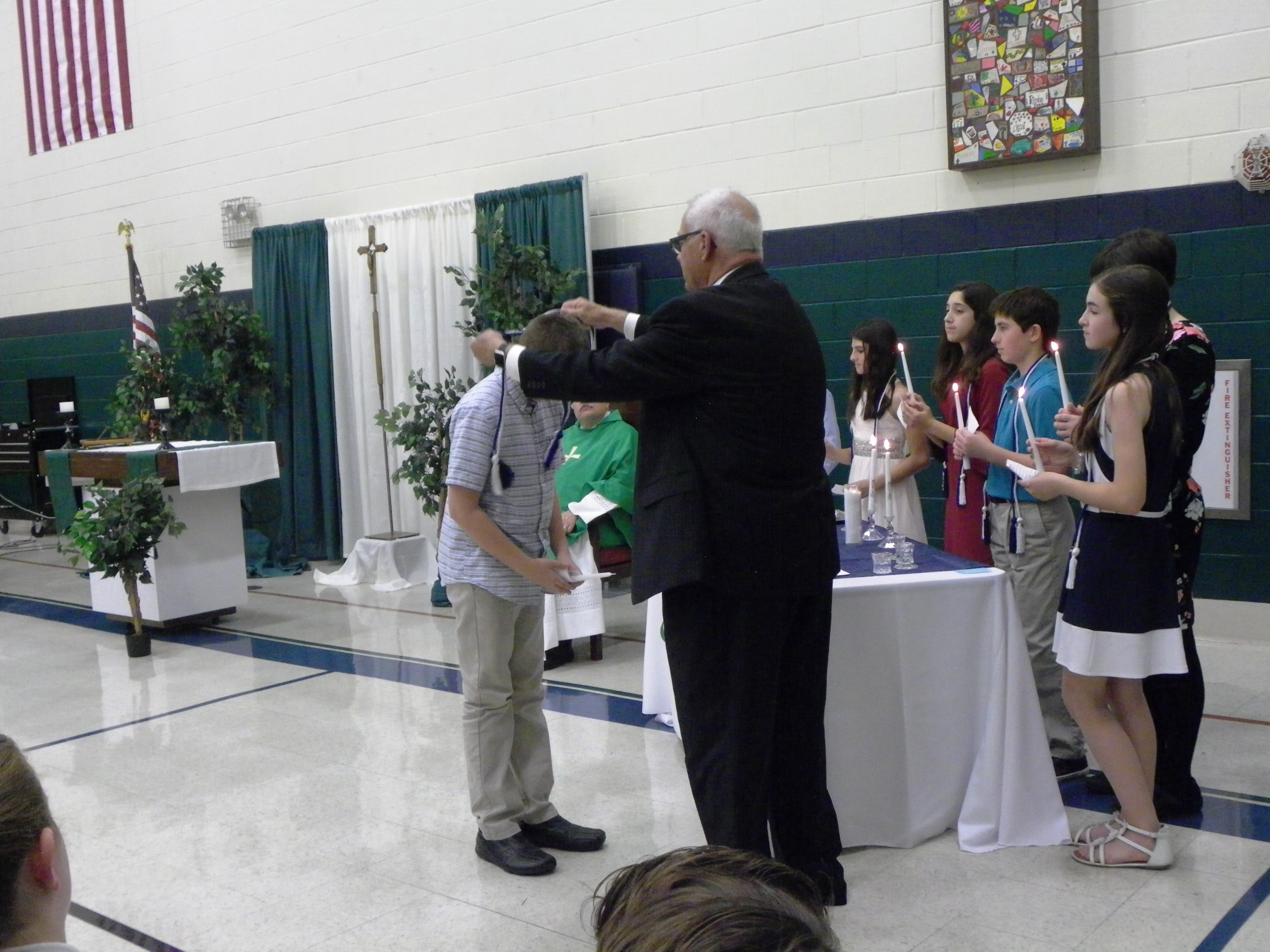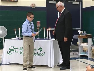 We can tell that we are officially back to school when our eighth grade class accepts the mantle of leadership during our traditional Leadership Mass.